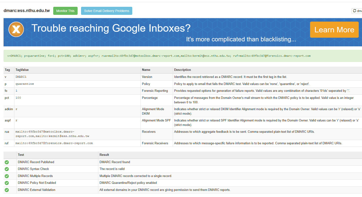 因近期有使用者反應頻繁被 Google 退信,為因應 Google 和 Yahoo 已於 2024 年 2 月生效的新的電子郵件寄送規則(註一),以及減少 ESS 網域寄至兩大服務業者的退信機率,目前已啟用 TLS 寄件及收件支援,以及提升 DMARC 規範為「p=quarantine」(註二)。